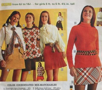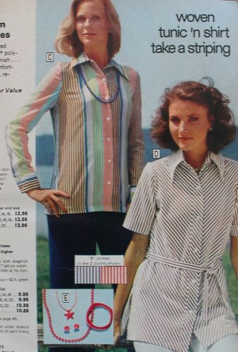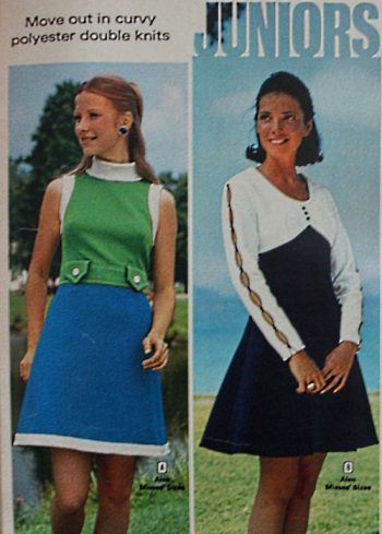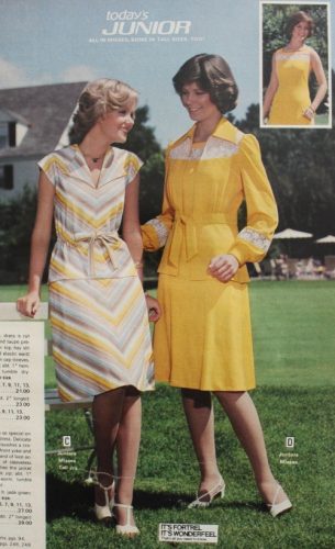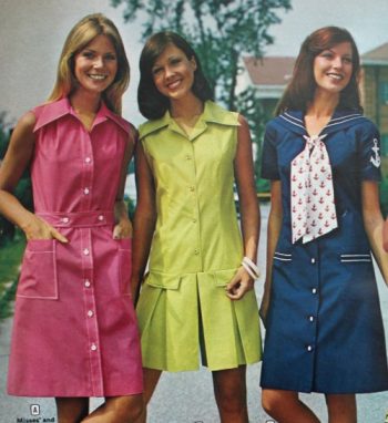 By 1973 dresses were looking more like ’40s and ’50s fashion with A-line or pleated skirts and button down tops. Simple one-piece dresses with a belt, cap sleeves, and swingy skirt or the two piece tunic blouse, skirt and tie belt made up most casual ’70s dresses. Many winter dresses came in the button up shirtwaist style with long bishop sleeves and matching belt. Necklines were still quite modest. Pussy bow neckties, small slits, mandarin collars, and large fold-out collars added variety without exposure. In the final years, the drawstring neck and waist belt along with a hemline that dropped to a few inches below the knee loosened up dresses even more.