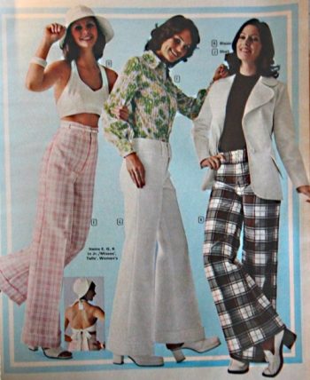 Women’s pants in the 70s had more diversity than the previous two decades combined. Some were waist high and wide leg while others were hip huggers with only a flared leg. Some were tight cigarette fit, straight leg, or very baggy. Some had cuffs, some didn’t. For most women, wearing cotton or polyester knit high waisted and wide leg pants in pastel colors paired with a tunic top, button-down blouse, or snug knit shirt was a daily fashion. Simple and comfortable, pants dominated most of the 1970s for both day and dressy evenings.