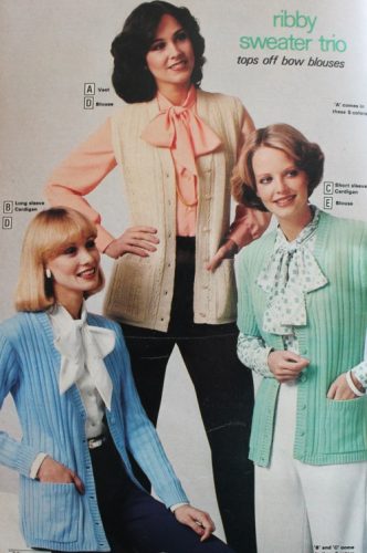 70s blouses were conservative button-down styles with oversized point collars. Polka dots, paisley, floral, and solids made into blouses with big pussy bows or small bow ties at the neck. Long sleeves featured the wide dolman shape or straight sleeves with a balloon wrist. Silk blouses were finally (more) affordable than they have been before WW2. Women saved and splurged on this natural fiber otherwise they work silk-like synthetics which were hot to wear. Sexy blouses had a very low v-neck, something wandering eyes hoped would reveal some cleavage. Since many small chested women didn’t wear bras this wasn’t an uncommon occurrence.