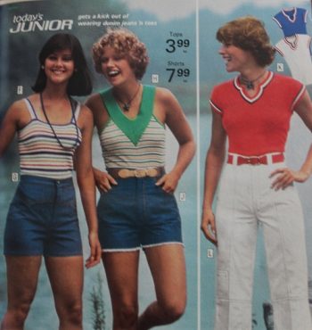 Mid-drift button down check prints shirts or crop knit tops were summertime casual favorites. The halter crop top was also a favorite look paired with high waisted flares or short shorts. Polo shirts zipped or buttoned up or were left open in a small V with straight or peter pan collars. They fit snug but not tights with short cap sleeves.